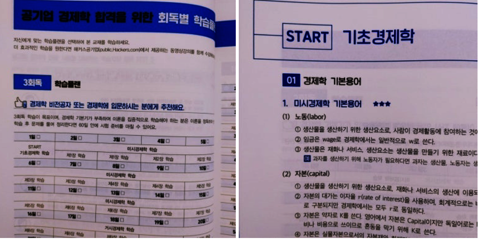 공기업 경제학 합격을 위한 학습 플랜도 3주차 플랜, 2주차 플랜, 1주차 플랜까지 스피디하게 이론을 정리하고 기출까지 마무리할 수 있는 알찬 구성입니다. 시작은 기초 경제학으로 워밍업을 해준 후 점차 심화되는 이론으로 깊이 들어가게 되는데 기초 경제학부터 탄탄하게 잡아준 후 이어서 들어가는 과정이어서 점진적으로 경제학 공부하기 좋은 구성이었고 기출까지 마무리 함으로써 완벽한 마무리를 이끌어낼 수 있을 것으로 기대하고 있습니다. 해커스 교재가 주는 강점, 인강 혜택을 누려보면서 체계적으로 공부하면 더 좋을 교재였고 인강을 듣지 않고도 교재 자체만으로도 충분히 원하는 결과를 도출해낼 수 있는 교재의 구성이라 마음에 쏙 들었습니다. 공기업 경제학 공부를 준비하고 계신 분들이나 이제 준비를 앞두고 계신 분들께 추천드립니다.