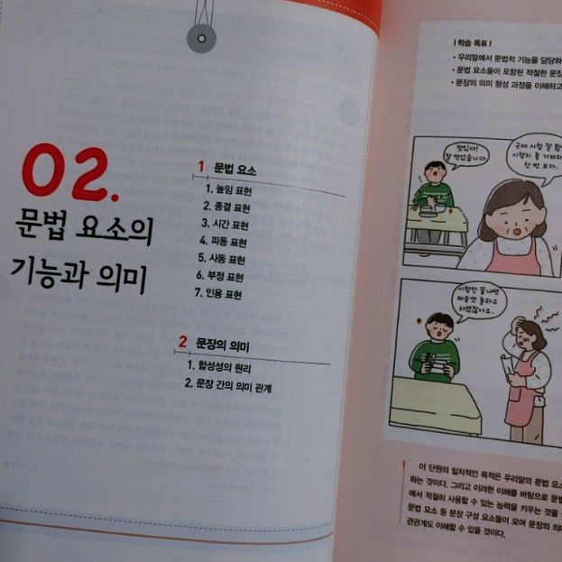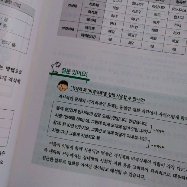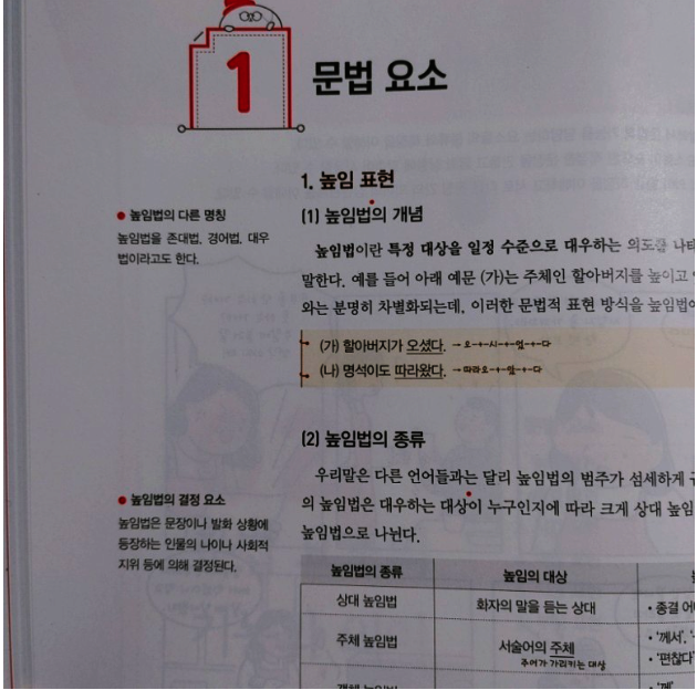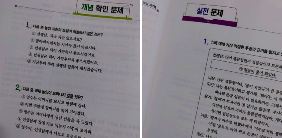 문제를 풀기 전 [질문 있어요!] 코너를 통해 국어 문법을 공부하다가 헷갈리거나 궁금할 수 있는 부분을 더 알아가는 시간을 가질 수 있어서 좋았습니다. 격식체와 비격식체를 함께 사용할 수 있을까, 없을까에 대한 내용도 대화의 맥락을 통해서 이해하기 쉽게 설명이 된 부분이 인상깊게 느껴졌습니다. 이렇듯 개념있는 국어문법 교재는 문법 공부 하다가 모르는 것들이나 더 알고 싶은 것들에 대한 부분을 완전 해소시켜줄 수 있을 정도의 쉬운 설명이 특징입니다.
