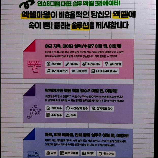 크리에이터 엑셀마왕님의 책이라 무조건 믿고 보셔도 됩니다. 엑셀 잘하는 사람이 업무 효율도 높고 척척 바로 해결이 되니 얼마나 편해요~~ 엑셀 못하는 사람은 원래 쓰던 형식에서 조금만 벗어나도 허우적거리기 마련이라 저와 같이 엑셀 자격증 있는 사람들도 없는 사람이라고 생각하고 이 책으로 실무에서 찐 도움이 되는 꿀팁들을 배워둬야 해요! 엑셀 환경을 내가 자주 쓰는 기능들을 빠르게 불러올 수 있도록 단축키 설정하는 방법부터 알려주고 날짜와 시간, 분수형식, 전화번호 입력에서의 실수들, 서식 적용과 같은 사항들을 하나도 놓치지 않고 머릿속에 저장할 수 있는 책이에요. 조건부 서식, 필터나 정렬, 데이터 유효성 검사, 데이터 입력 수정 빨리 하는 방법등과 같이 진짜 도움이 되는 방법들이 한가득이라 도움이 많이 되었어요. 함수나 차트 활용 방법들도 시각화해서 이해하기 쉬웠고 피벗테이블도 책 덕분에 다시 이해했어요. 자격증용 공부랑 실제 도움이 되는 엑셀 지식은 사뭇 다르게 느껴지더라구요. 특히 자격증 공부에서는 절대 없었던 이면지 없이 인쇄하기나 엑셀 이미지 활용 마스터, 일잘러의 문서 관리법과 같은 것은 그저 빛이었습니다. 이렇게 소소하고 자잘한 것들까지 알려주는 책이어서 다시는 엑셀때문에 속앓이 하지 않을것 같아요.