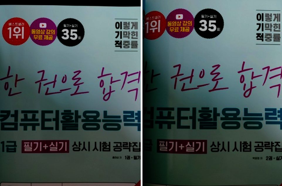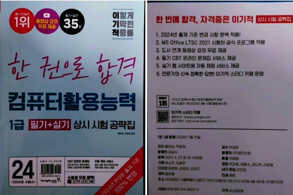 필기와 실기로 분권해서 공부할 수도 있게끔 분권이 잘 되어지는 책이라는 것 확인해보시구요~ 새로 바뀐 출제 기준에 완벽하게 적용된 책이고 MS Office LTSC 2021 시행처 공식 프로그램 적용은 물론 교재 연계 동영상 강의가 무료라서 부담없이 공부할 수 있는 책이에요. 상시 시험 공략집이라는 이름에 걸맞게 CBT 온라인 문제집 서비스도 제공되고 실기 웹 사이트용 자동 채점 서비스도 제공되지요. 필기와 실기 도합 35회분의 문제를 풀면서 공부할 수 있다는 것이 이기적 컴퓨터활용능력 1급 필기+실기 상시 시험 공략집의 매력 포인트랍니다.