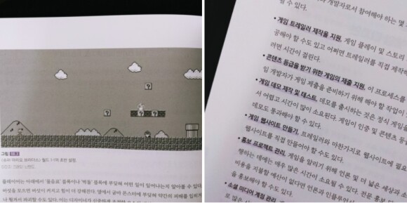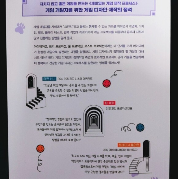 어렸을 때 정말 좋아했던 슈퍼마리오 게임이 예시로 나오면서 반가운 마음과 함께 더 재미있게 책을 이해할 수 있었습니다. 머릿속으로 떠올린 이미지, 상상했던 스토리를 바탕으로 나만의 게임을 만들 수 있다는 생각만으로도 짜릿함을 느낍니다. 누구나 아는 유명한 게임이 탄생하기까지의 과정들이 결코 순탄치만은 않았듯 하나씩 게임 제작에 대한 프로세스를 배우고 나만의 게임을 세상에 탄생시킨다는 꿈을 갖고 접근하면 비슷하게라도 가지 않을까 하는 기분좋은 상상도 해봅니다. 게임 제작 프로세스에는 4가지 단계가 있는데 아이데이션, 프리 프로덕션, 풀 프로덕션, 포스트 프로덕션의 순입니다. 아이데이션에서 아이디어, 조사, 프로토타입, 프로젝트 목표를 진행하고 프리 프로덕션에서 버티컬 슬라이스, 게임 디자인 매크로, 스케줄을 진행합니다. 풀 프로덕션에서 알파단계, 베타 단계를 거치고 포스트 프로덕션으로 출시 후보 마무리를 합니다. 게임 제작 프로세스의 큰 틀 안에 포함되어 있는 세부 사항들을 하나씩 읽고 접하는 과정이 흥미롭습니다.