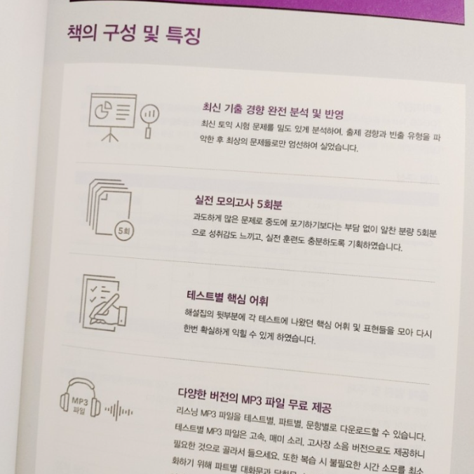 토익 공부도 영어 공부라서 어휘 공부가 중요한데 테스트별 핵심 어휘도 제공되어서 어휘 학습에서도 도움을 많이 받을 수 있는 교재입니다.