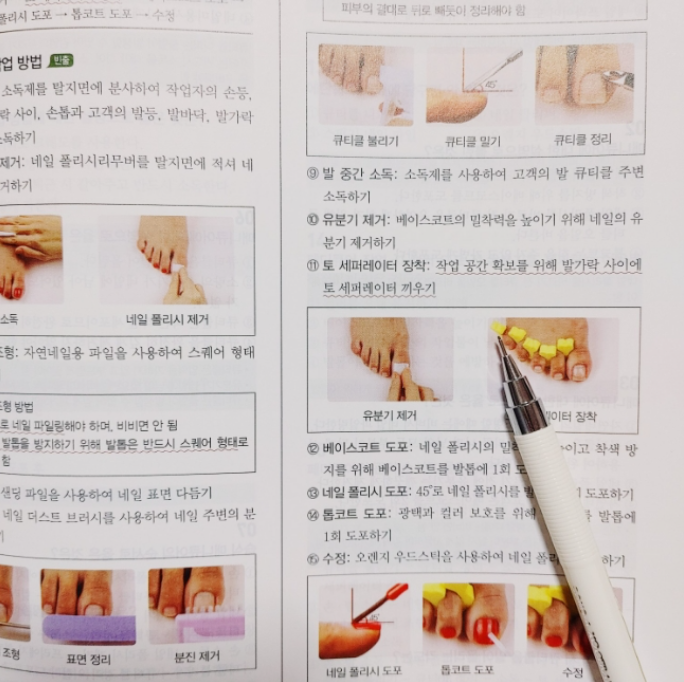 여러분들은 혹시 네일아트 좋아하시나요? 큐티클 정리만 잘 해도 손이 엄청 깔끔해보이고 정돈된 손이 되어 관리 좀 하는 사람의 손의 모습이 되더라구요. 기본 케어부터 젤네일 색상 바꾸고 여러가지 예쁜 파츠들 올리는 취미가 생겨서 자주 샵에 방문하고 싶지만 정기적으로 다녀오기엔 부담이 되어 기를 수 있을때까지 최대한 손톱을 기르고 다시 샵에 방문하는데 그러면 손톱이 너무 안예뻐지더라구요. 손톱 관리, 네일아트에 관심이 많으신 분들이라면 셀프로 관리 열심히 하실텐데 기왕이면 전문가 느낌 물씬 나도록 제대로 배워보고 싶더라구요. 그래서 시작한 2023 에듀윌 네일미용사 필기 1주끝장책은 네일에 관한 기초부터 꼭 알아야 할 상식이 담겨있는 알짜배기 네일아트 필기책이에요. 네일미용사 필기 수험서로 구성이 좋아서 네일 필기시험 무난히 합격할 수 있겠더라구요.
