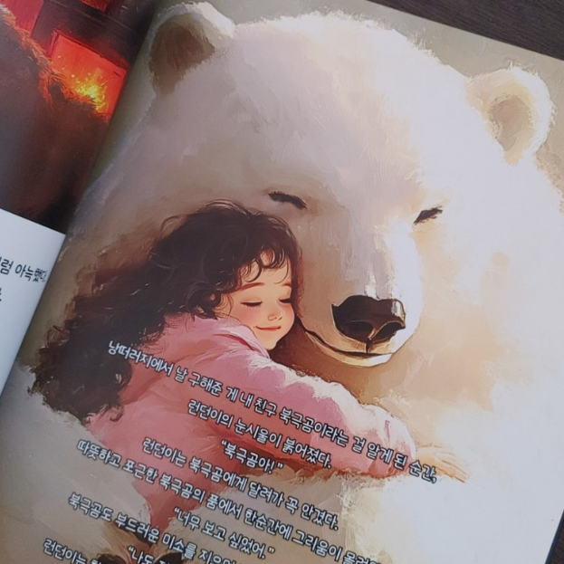 있을 수 없는 이야기라고 생각되는 부분은 판타지 동화의 특성상 지극히 몇개의 설정 뿐 한번 이야기에 빠져들기 시작하면 내가 런던이가 되어 순수한 동심속으로 자연스럽게 녹아들게 되더라구요. 할아버지의 SOS에 런던이의 위험을 감지하고 구해준 북극곰에게는 귀여운 꼬마 해피라는 곰돌이가 있죠. 해피가 갖고 있는 고민거리들을 우리의 친구 런던이가 공감하고 이해하며 풀어나가요. 친구들과의 갈등이 있는 또래 친구들에게 공감이 되는 주제가 동화 속에 녹아있는 것이죠.