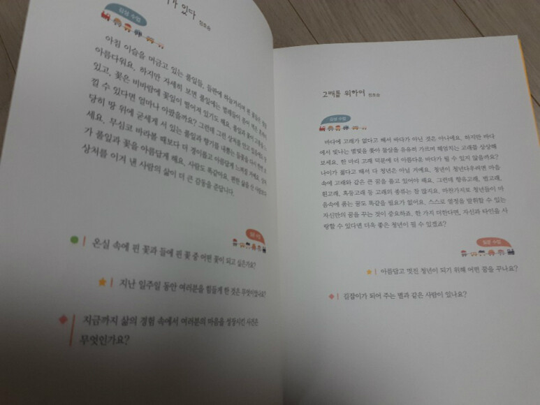 책이 시로만 또는 소설으로만 구성되어 있으면 아이들이 읽다가 말아버리는 경우도 있는데, '문학이 온다' 책은 시, 소설, 수필 등으로 구성된 점이 좋았어요.