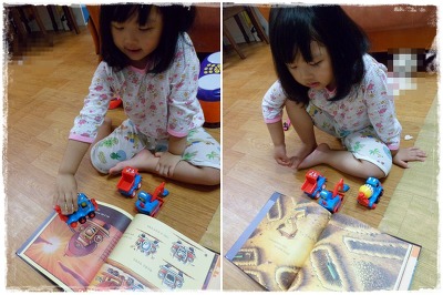 아이가... 책을 모두 읽은 후, 사촌오빠가 준 뽀로로 자동차를 꺼내옵니다.