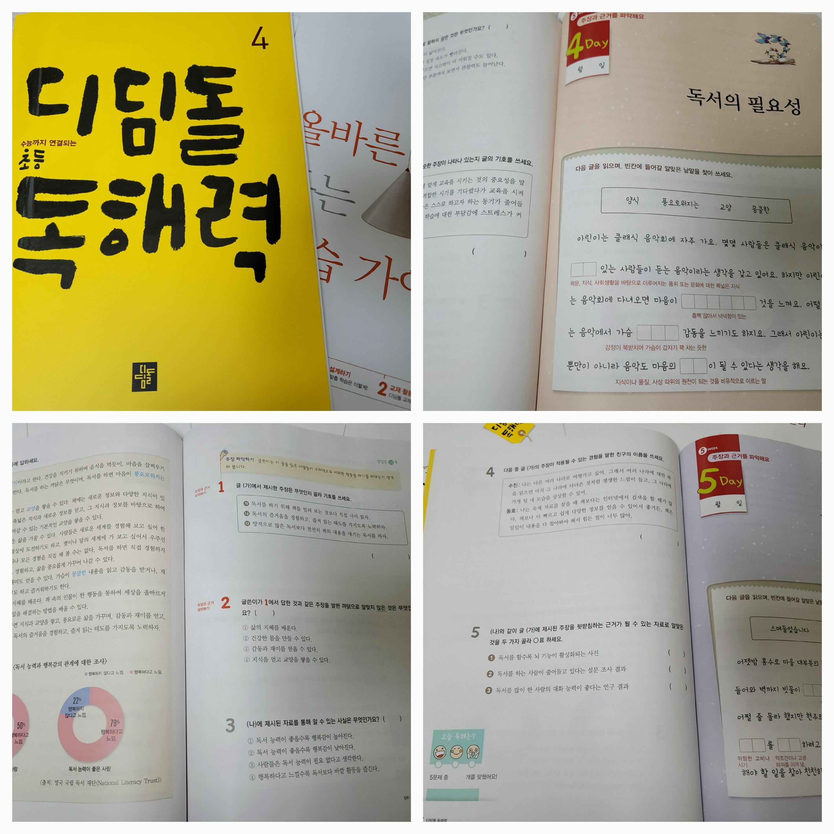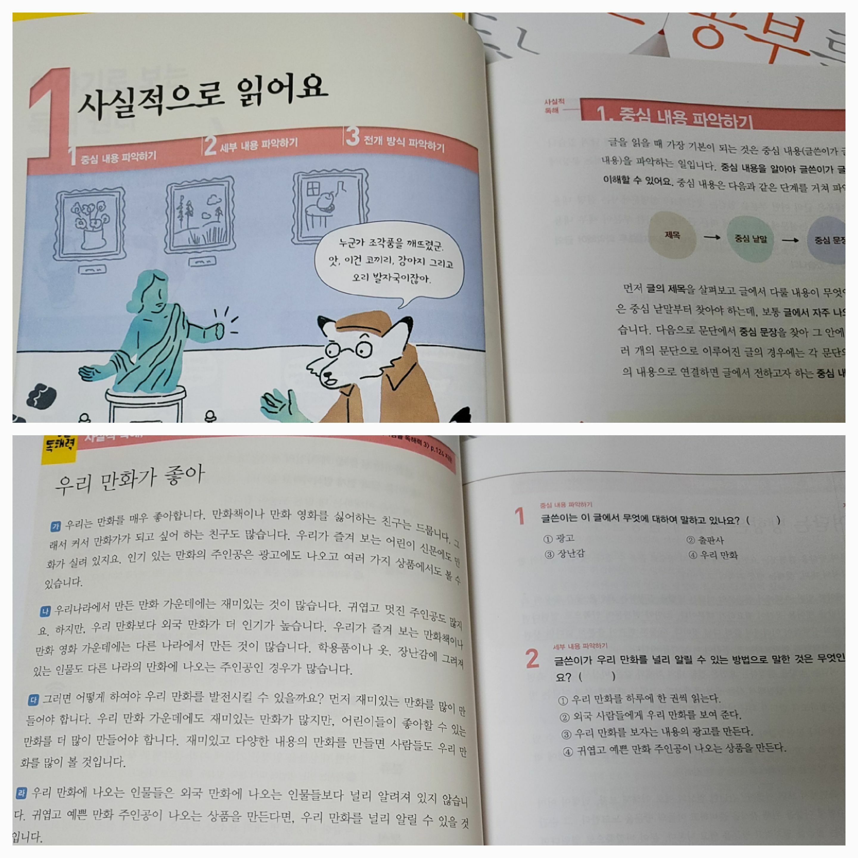 국어는 학습내용을 만화로 살펴보고 단원 열기를 통해 이번에 배울 것을 한 눈에 볼 수 있다. 교과서 살펴보기에서의 지문을 읽고 문제를 풀며 아이의 실력을 확인하고 낱말공부도 할 수 있어서 이롭다.