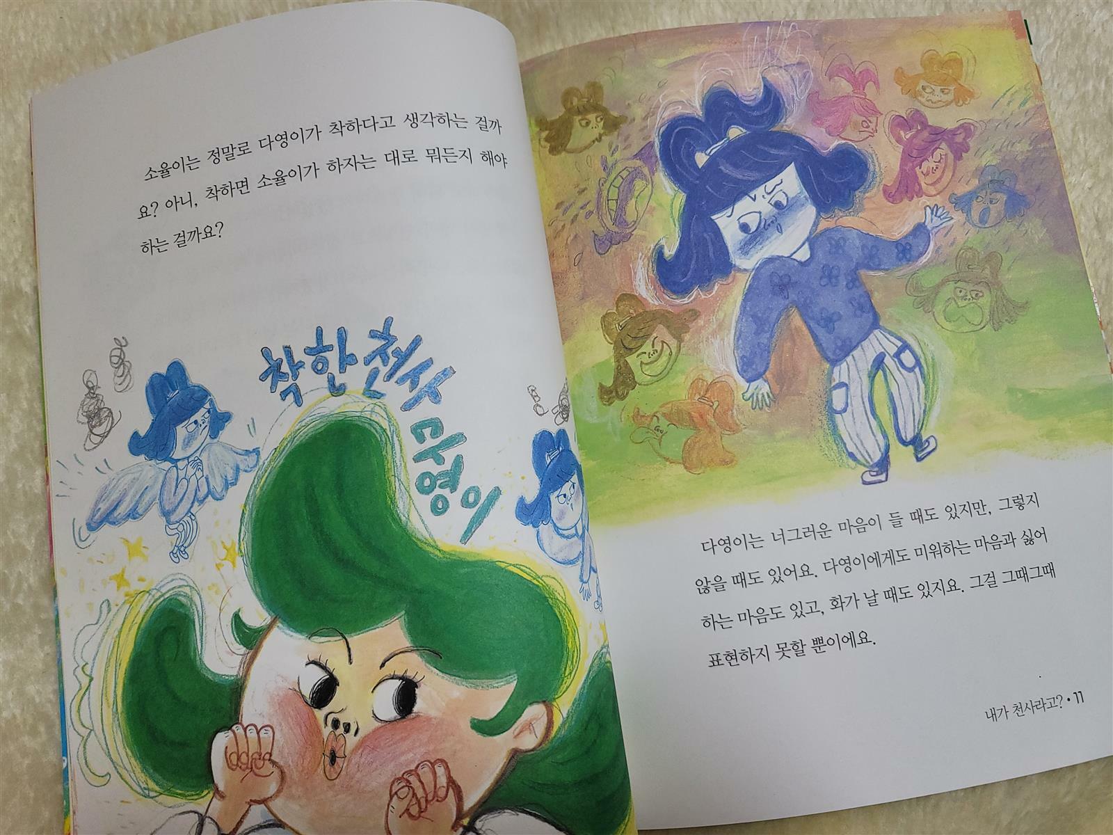 10주동안 보도록 표시가 되어있고 요일도 나와있어서 보기 편했다. 이렇게 표시되어 있으니 하루도 빠짐없이 보고 확인하기도 좋았다. 그날의 사자성어가 한글로 나오고 바로 옆에 한자가 씌여있다. 그 밑에 한자의 음과 뜻이 나오고 아이가 이해하기 쉽게 설명이 되어있어서 도움이 되었다. 귀여운 캐릭터의 등장이 아이를 웃게 만들었다. 견물생심에서 아이들이 좋아하는 빵과 우유로 이해하기 쉽도록 상황 설명이 되어있어서 아이는 일상생활 중 대화에서 이 사자성어를 사용해볼 수 있겠다고 말했다. 만화를 읽고 사자성어의 뜻을 이해하고 나면 바로 옆 페이지에서 간단한 문제들을 풀어볼 수 있다. 표현력과 어휘력, 독해력을 키워볼 수 있는 문제들로 구성되어 있어서 부모인 내가봐도 만족스러웠다. 아이에게 어려울것같은 문제에는 힌트가 주어지고 아이가 문제를 해결하는데 도와주기 때문에 큰 어려움없이 잘 풀어내는 모습을 볼 수 있었다.
