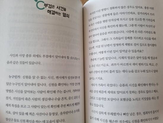 부검을 하는 과정도 아주 세세하게 알려준다. 검안과 해부를 하는 순서를 담담한 어투로 들려주는데 장면을 상상해보면 매우 진지하고, 어려운 일일 것 같다. 저자는 첫 부검을 할 때 덤덤한 마음이었다고 하는데 그것이 법의학자가 갖춰야 할 기초 자격이라고 한다.