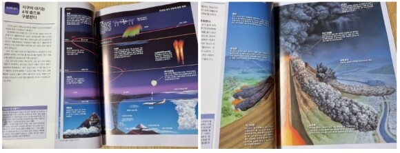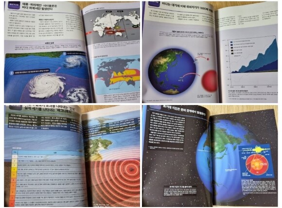 1, 2장에서는 우리가 살아가는 지구에 대해서 화산, 판, 지진 등의 대지 활동을 소개하고, 3장에서는 대기와 해양을 중심으로 대기 순환과 날씨, 이상 기후를 다룬다. 4장에서는 우주에 대한 내용으로 태양계와 우리 은하, 지구의 위성인 달에 대해서 소개하고, 5장에서는 지구의 역사에 대해서 다룬다. 지구과학에서 다루는 모든 영역을 담아놓았기 때문에 내용이 소홀하지 않을까 생각할 수 있지만 다양한 사진, 그림 자료와 도표 등을 이용하여 엄청 자세하게 설명을 해준다. 이 한 권으로 전체적인 지구과학의 개념을 정리하고 교과 학습을 하면 이해하는데 많은 도움이 될 것이다.