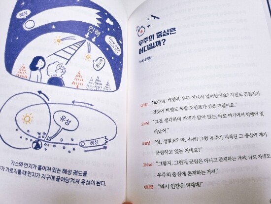 그래서 <세상의 모든 답은 우주에 있다>라는 책제목이 와닿았다. 학창시절에 우주는 외워야할 이름이 많은 대상일 뿐이었다. 여러 책을 읽고, 영상으로 우주의 신비로움을 경험할 때면 왜 천문학자들이 별과 하늘, 우주에 빠져드는지 알 수 있었다. 우주 속의 한 생명체로 살아가면서 내가 살고 있는 우주가 어떻게, 언제 생겨났을까에 대한 탐구는 한 번도 해보지 않았다. 책에서는 우주의 시작부터 빅뱅, 별, 행성, 빛, 달, 지진, 밀물과 썰물, 태양과 지구의 관계, 외계생명체와 같은 우주와 지구에 관한 궁금한 질문에 대한 답을 해준다. 마지막 부분에는 나를 알고, 생명의 공평함과 인간의 죽음, 인류의 멸망까지 다루어주어서 생명의 시작인 우주의 탄생부터 우리의 죽음까지 한평생에 대해 생각해볼 수 있는 기회를 제공해준다.