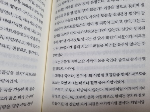 여자들은 전쟁에 직접 나서지는 않았지만, 브리세이스 왕비처럼 자신의 가족, 형제, 친구를 죽인 자들에게 노예로 끌려와 그들의 여자로 살 수 밖에 없었다. 왕비는 영웅이 아니라 한 남자 아킬레우스에 대해 알게 되었다. 우리가 알던 신화를 좀더 깊이 들어가보면 더 많은 사람들의 더 많은 아픈 이야기가 숨어 있다는 것을 알 수 있는 책이다.