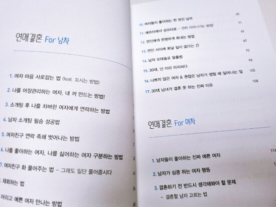 책이 도착하고, 어떤 책인지 궁금한 마음에 이리 저리 들춰보다가 끝까지 다 읽어 버렸다. 누구나 궁금해할만한 이야기들을 자연스럽게 풀어놓는다. 연애를 하기 전에 이 책을 읽었더라면 하는 생각이 들만큼 아주 구체적으로 자세하게 표현되어 있다. 목차를 보면 내용이 정말 궁금해질 것이다.