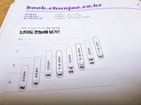 교재 뒤쪽에 난이도 한눈에 보기가 있다. 이것을 보니 어느 정도 수준으로 고르면 될지 찾기 쉬웠다. 수학 기본 개념 이해는 빠르게 하는 편이어서 기본 수준의 수학리더보다는 응용문제도 포함된 수학리더 기본 응용을 선택했다.