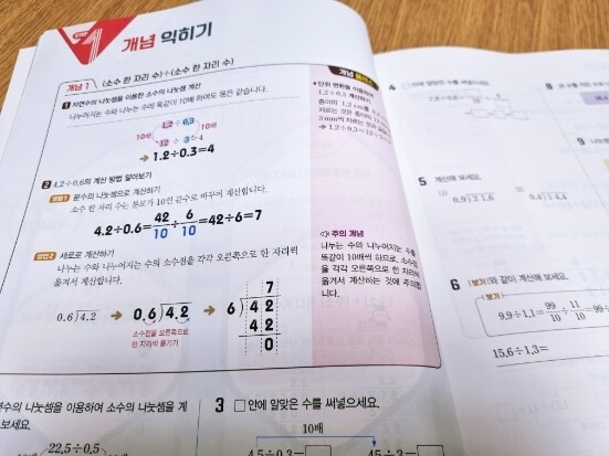 한 학기 수학 교재가 8권이라니 정말 다양한 교재가 준비되어 있다. 교재는 진도책, 복습책, 풀이집 이렇게 3권으로 구성되어 있고, 분철되기 때문에 활용이 편리하다. 1. 개념 익히기, 2. 기본 다지기, 3. 응용력 올리기, 단원 기본 평가, 성취도 평가 이렇게 차근차근 학습할 수 있게 구성되어 있다. 복습책은 응용력 강화문제, 단원별 실력평가, 단원 성취도평가가 있어서 학기 중간에 한 번씩 풀면 앞의 내용을 복습하기에 좋을 것 같다. 개념학습 영상을 볼 수 있는 QR코드가 있어서 혼자 공부하다가 이해가 안될 때 참고할 수 있다.