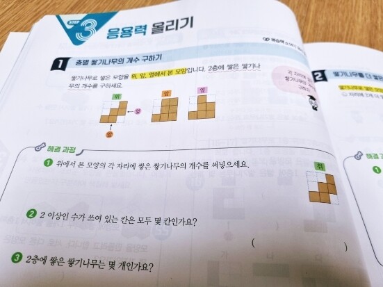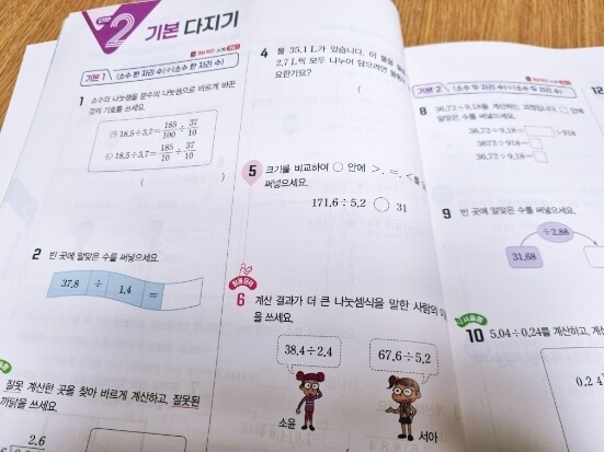 아이의 수학 예습 교재로 수학 리더 기본+응용을 선택해서 활용해 보았다. 수학 교재를 정하면서 가장 어려운 점은 난이도 선택이다. 한 출판사에도 수학은 난이도별로 정말 다양한 교재가 있다. 그래서 우리 아이의 수학 학습 능력이 어느 정도인지 파악해서 효과적인 교재를 정하는 것이 엄청 중요하다. 너무 쉬운 것을 선택하면 아이가 지루해하고, 너무 어려운 것을 고르면 못 풀어서 짜증을 내고... 학습을 많이 하는 것은 싫어하는 아이라서 기본 교재를 한 권하고, 심화 교재를 1권 정도 한 학기에 할 수 있다.
