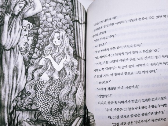 한 해의 마지막 날에도 난나는 성냥을 팔기 위해 거리에서 몸을 숙인 채 걷고 있었다. 할머니가 돌아가시고, 아빠는 술에 취해 있어 매일 매일이 배고프고 힘든 난나는 '성냥 사세요.'를 외치며 다닌다. 어디선가 들려오는 섬뜩한 외침 뒤에 떨어진 핏물...눈의 여왕의 저주로 인간을 물고 뜯는 괴물 '겨울시체'가 곳곳에 다닌다. 마지막에 성냥불을 켜는 원작의 이야기와 묘하게 닮은 점이 있으면서 전혀 예상하지 못했던 장면이 있어서 재미있다. 영화로 좀비를 만나면 생생한 모습ㅇ; 너무 무서워서 좀비 영화는 잘 안보는 편인데 책으로 만나는 좀비는 새로운 느낌이다. 인어 아리의 이야기는 아리가 칼을 파도 속에 던져 버리는 것으로 시작된다. 왕자의 사랑을 얻지 못한 것은 원작과 같지만 누르를 없애겠다며 해마가 끄는 마차를 타고 가는 아리의 모습은 원작의 인어보다 더 당당하고 적극적으로 표현되어서 마음에 들었다.