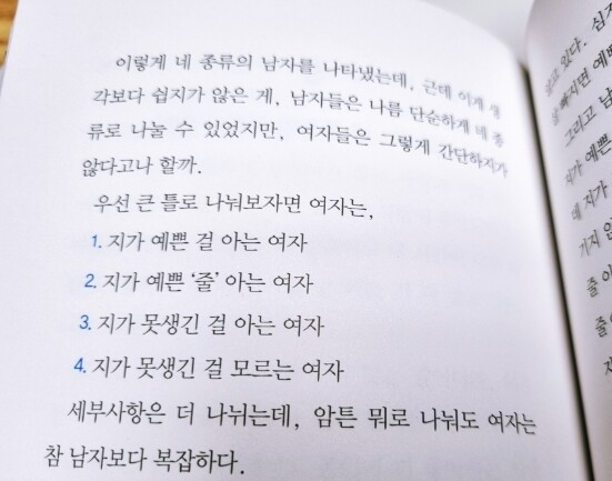 여자는 지가 예쁜 걸 아는 여자, 지가 예쁜 줄 아는 여자, 지가 못생긴 걸 아는 여자, 지가 못생긴 걸 모르는 여자 이렇게 4종류로 나눌 수 있다. '못생긴 걸 아는 여자'는 스스로 못생긴 걸 알고 노력하는 유형과 노력해도 안된다고 생각하고 의지도 없고 자존감 낮은 유형이 있다. 후자의 경우 '외모가 뭐가 대수야'라는 마인드를 버리고 노력하면 된다고 조언한다.