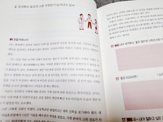 이 책은 제목처럼 '대학'을 목표로 하는 것이 아니라 '직업'을 목표로 진로를 설계하는데 도움이 되는 진로 독서 워크북이다. 대학은 나와야하지 않나 하는 생각에 자신에게 필요한 직업에 학사 자격이 필요없더라도 대학에 가고, 4년을 보낸뒤 전공과 관계없는 일을 하는 경우도 많이 본다. 성적에 맞추어 인기 있는 학과에 입학했는데 정작 자신의 적성에 맞지 않아서 재수를 하는 사람도 많다. 다양한 경험을 해보지 못하고 책으로 공부만 하고 입시를 준비한 결과일 것이다.