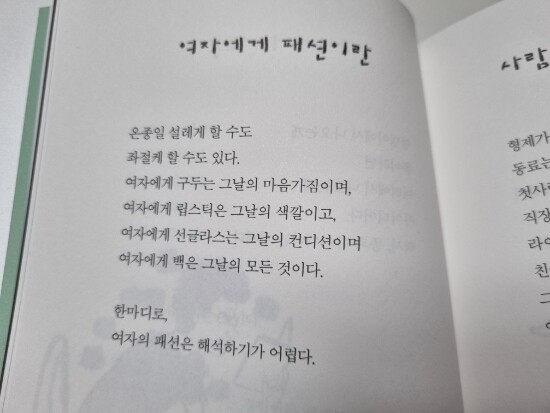 몇 가지 글을 소개해보면 '여자에게 패션이란 온종이 설레게 할 수도 좌절케 할 수도 있다...한마디로, 여자의 패션은 해석하기가 어렵다.' 는 구절이 있다. 글을 읽고 나면 나에게 패션은 무엇일까에 대해 생각해보게 된다. 친구를 읽으면 내 친구는 나에게 어떤 존재인지 생각해보게 되고, 비타민 C와 같은 글을 읽으면 말이 주는 재미에 웃음 짓게 된다. 가볍게 읽고, 그 주제에 대한 내 생각을 떠올려보는 것. 그것이 이 책의 목적인 것 같다. 서재의 책장에 꽂아두는 책이 아니라 화장실 변기 옆에 두고 쉽게 보는 책. 그래서 원래 화장실에서 책을 보지 않지만 화장실에 가져다 놓아 보았다. "어~책이 왜 여기 있지? 제목이 재미있네"하면서 일단 한 번 펼쳐들게 되는 책이다. 글을 읽고 자신의 생각을 써보면 재미있을 것 같다.