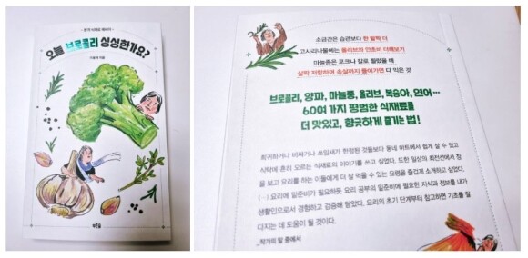 '음식과 요리에서 기초란 언제나 그리고 영원히 중요하다.'라는 문장이 있다. 순서도, 방법도, 재료도 적당히였던 내 요리에 기초란 없었다. 향신료에 대해서 차근차근 소개해주는데 각 향신료와 관련된 에피소드, 향신료의 특징, 향신료를 보관하는 방법을 알려준다. 에세이라서 그런지 지식책이라는 느낌이 강하지 않아서 재미있고 쉽게 읽힌다. 육수에 대한 소개가 많은 도움이 되었다. 예전에 닭 육수를 내고 비려서 버린 적이 있는데 책에 닭육수 내는 요령이 아주 자세히 있다. 닭으로 직접 내기 어려우면 인스턴트 고형, 페이스트형 제품으로 인스턴트 육수를 만드는 방법도 있다고 한다. 책 제목에 있는 '브로콜리' 소개는 좀더 꼼꼼히 읽었다. 브로콜리를 이렇게 자세히 할 수 있다니! 싱싱해보이는 것을 사서 씻고 손질해 데쳐서 초장에 찍어 먹는 것이 전부였는데 그래도 아이들이 참 좋아하는 채소이다. 브로콜리 손질법, 요리법, 식재료 이야기 중간중간 맛있는 레시피까지 있다.