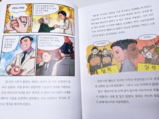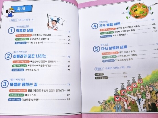 "지적인 대화를 위한 넓고 얕은 지식"의 어린이 버전인 채사장의 지대넓얕 3권이다. 어린이용 책이라 재미로 읽는 가벼운 수준의 책인가 했는데 세계 대공황과 세계대전을 꽤 자세히 다루고 있는 어린이 교양 도서이다. 목차를 보면 세계 경제대공황, 제2차 세계대전, 태평양 전쟁, 냉전시대 이렇게 다섯 가지 주제에 대해 이야기하고 있다. 알파, 마스터, 채, 빌헬름 등의 개성 있는 인물이 등장하여 그들의 에피소드를 통해 세계 역사적 사건을 재미있게 소개한다. 알파와 채는 허름한 행색으로 허드슨강변에서 만난다. 알파는 기업가였지만 경제대공항 때문에 모든 것을 잃는다. 채는 월스트리트를 배회하던 평범한 사람이다. 사실 알파는 인류의 진화를 돕기 위해 지구로 온 쪼렙신인데 채와 만난 첫날 그것을 고백한다.