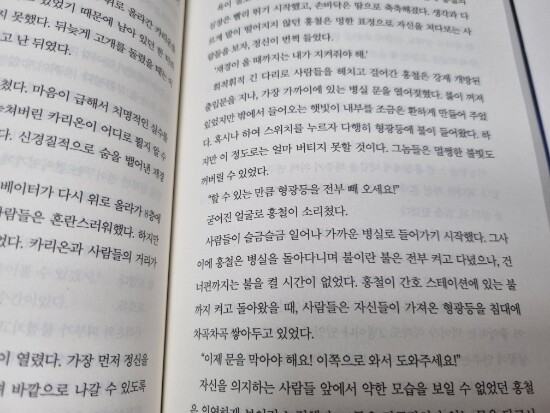 병원이라는 공간은 왠지 섬뜩한 분위기의 장소로 자주 묘사된다. 이 책에서도 병원은 그런 곳이다. 폐쇄된 공간에 갇히게 된 사람들에게 알 수 없는 끔찍한 일이 발생한다. 흑백으로만 보이는 사람들에게 정체를 알 수 없는 괴물은 더욱 무서운 존재로 다가온다. 박하는 신기하게도 흑백으로 보이지 않고 괴물도 볼 수 있다. 인간을 자양분으로 점점 커져가는 괴물 카리온과 병원에 갇혀 버린 사람들... 결말이 궁금하여 거의 600여쪽에 가까운 분량의 책잊데 책장이 술술 잘 넘어갔다. 작가님의 상상력이 대단하다.