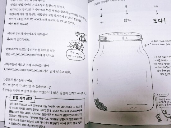 책 구석 구석 등장하는 새와 말이 있다. 말이 처음 하는 말이다. "새야, 우리가 우주 속에 있는 거야?" 이 말이 작가가 아이들에게 가장 해주고 싶었던 말일 것 같다. 우주는 우리를 둘러싼 모든 것이자, 우리 너머의 모든 것이며 우리가 바로 우주다. 우리가 정말 거대한 우주 속에 미미한 존재일 뿐이라는 것을 아는 순간 우리는 아둥바둥 살고 있는 나 자신의 행동이 허무해지기도 하고, 굳이 누군가를 이겨보려고, 더 잘 살아보려고 하는 것보다 아름다운 마음으로 인생을 즐기며 살아야겠다는 생각을 한다. 텅비어 있고, 아주 큰 우주를 작가는 이렇게 큰 유리병으로 표현했다. 한 페이지의 대부분을 차지한 비어있는 유리병을 보며 아이들은 직관적으로 우주가 어떤 상태의 공간인지 이해하게 된다. 그 속의 아주 작은 모래알 하나가 우리들. 이렇게 방대한 정보를 아이들에게 쉽고 재미있게 이해시키려면 폭넓은 분야의 지식을 가지고 있어야 한다. 우리가 존재하고 있는 공간이지만 너무 커서 한 눈에 담을 수 없는 우주를 이해하는 것은 쉽지 않다. 블랙홀은 크고 검은 원모양으로, 한 페이지 가득 한글자씩 써놓은 빅! 뱅!은 그림과 글자 그것만으로도 그 낱말이 가지고 있는 이미지를 잘 표현해 준다.