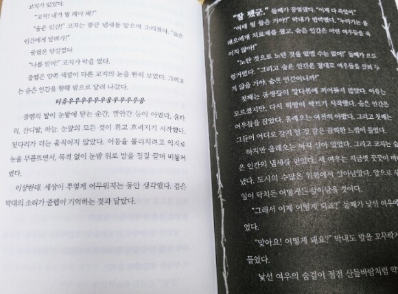 사슴뿔 숲에 겨울이 찾아왔다. 겨울이 찾아온 숲에 모든 동물들은 굴속으로, 나무줄기속으로 숨어들어 고요해졌지만 여우는 달랐다. 폭설이 내린 날 어린 여우 세 남매는 신선한 먹이를 찾아오라고 한 엄마의 말에 밖으로 나와 장난을 친다. 두 동생이 뛰어가서 보이지 않자 첫째는 걱정을 하며 찾는데 신선한 피 냄새를 맡았다는 말에 불안했다. 다행스럽게도 그 피냄새는 동생들의 것이 아니었고, 거기서 상처를 심하게 입은 여우 한 마리를 발견한다. 그 낯선 여우는 자신을 도와달라며 여우에게 무슨 일이 있었는지 말해야한다고 말한다. 그렇게 낯선 여우는 도시 속에서 일어나는 여우의 이야기를 들려준다. 낯선 여우와 세 남매가 이야기하는 장면은 검은 색, 낯선 여우의 이야기는 흰색 종이로 되어 있다. 낯선 여우가 들려주는 이야기는 어린 여우에게는 너무 섬뜩하다. 농장의 여우들은 B-838, O-370과 같은 방식으로 불린다.