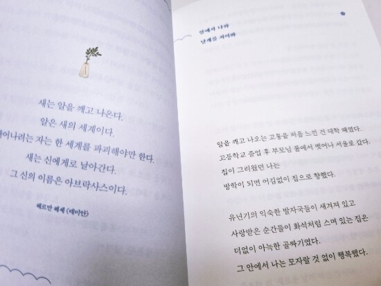 중학교 입학 후에 처음 읽었던 책이 헤르만 헤세의 <데미안>이었다. 국어 선생님이셨던 담임 선생님의 추천으로 읽은 데미안이었는데 그 속에 담겨 있는 의미를 어린 나는 발견하지 못했다. 성인이 되어 다시 읽으면서 짧은 문장 하나에도 세상의 지혜를 담고 있는 헤세의 위대함을 느꼈다. "새는 알을 깨고 나온다. 알은 새의 세계이다." 알을 깨고 나오는 고통을 작가님은 대학 때 처음 느꼈다고 한다. 부모님으로부터의 첫 독립. 그때 다시 돌아가는 부모님의 집은 '아늑한 골짜기'라고 표현한 부분이 참 공감되었다. 부모님은 항상 그런 존재이니까.