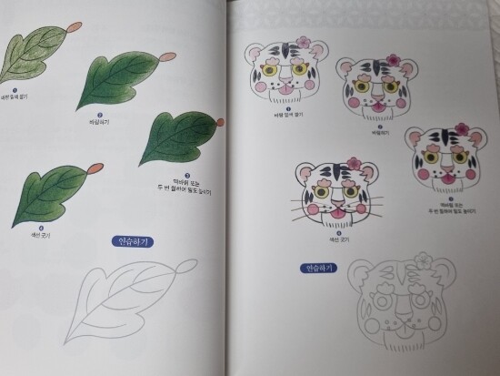 우리 주변에서 볼 수 있는 자연을 화려한 색감으로 칠해놓아서 민화는 한 번 보아도 오래도록 기억이 난다. 나는 민화하면 퉁방울처럼 튀어나온 호랑이의 눈, 흑백이 대비되는 까치, 선명하지만 복잡하지 않은 색상의 꽃이 떠오른다. 모란도, 복주머니, 해바라기, 화접도, 화조도, 백수백복도, 문자도, 해태 등 우리나라 민화에서 볼 수 있는 그림과 함께 날개 달린 사자, 유니콘처럼 서양을 상징하는 도안도 있다. 채색도구, 색연필로 그라데이션 넣는 방법 등을 자세히 소개해두었고, 기본 채색을 연습하는 공간도 있다. 왼쪽에는 채색된 도안이 있고, 오른쪽은 내가 직접 색칠해보는 공간이다. 꼭 왼쪽의 예시도안과 같게 채색할 필요는 없지만, 화려한 색감을 흉내내기에 좋다.