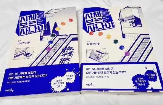 색감이 비슷해서 언뜻 보면 더 비기닝의 1, 2권 표지가 같은 것 같지만 다르다. 1권은 공이 에스컬레이터 오른쪽에서 내려오고, 메모리카드와 박스가 보인다. 2권은 왼쪽에서 공이 내려오고, CCTV가 있다. 표지부터 어떤 이야기일까 궁금하게 만드는 미스터리는 항상 흥미진진해서 책장이 넘어가는 것이 아쉽다. '시체를 보는 사나이'라는 제목 덕분에 내용을 읽기 전에 등장인물이 어떤 사람일지 예상을 할 수 있었다. 1부이고 더 비기닝 1, 2권이니 앞으로 많은 시리즈가 계속해서 출간될 것 같아서 기대된다. 네이버 베스트리그 TOP5에 들고 독자 별점평이 9.92라고 한다.
