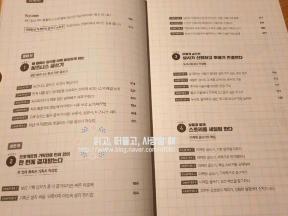 가지로 나뉜다고 볼 수 있겠다. 첫 파트는 비즈니스 글쓰기 그리고 마지막 파트는 독서법과 생활 글쓰기이다. 사실 나는 비즈니스용 글쓰기를 해본