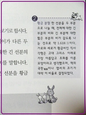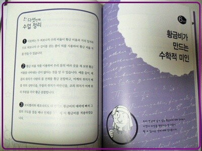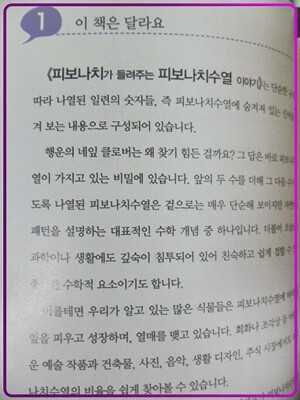 수학자가 들려주는 수학이야기 시리즈는 워낙 과학시리즈가 명성이 높아 잘 알고 있 던 차에 같은 출판사에 같은 시리즈명의 수학책이 있음을 알면서 아이에게 권해주게 된 시리즈입니다. 사실 아이는 워낙 과학을 좋아했기에 과학자 시리즈는 무난히 보고 특히 중학생 언니 는 아이가 배우는 과학 학과 내용과도 잘 맞기에 큰애 작은애 열심히 보고있는 중인데 수학은 아무래도 내용이 어렵지 않을까 했는데 아무래도 과학자 시리즈 보다는 덜 관심 갖기에 걱정을 했으나 두번째로 만난 피보나치가 들려주는 피보나치수열이야기 는 너무나 재미있다고 하며 재미있게 끝까지 읽었습니다. 피보나치 수열이라 하면 아마도 수학에 아주 관심이 있지 않은 아이가 아니고선 누구지? 라며 의문을 가지겠지만....1,1,2,3,5.,8,13....이런 수의 배열이라면 초등 5학년 이상의 아이들은 이 숫자를 이용한 문제를 한 번쯤 꼭 만났고 앞의 두 수를 더한 값이 뒤의 수 임을 쉽게 눈치챌 것입니다. 그런데 엄마조차 무심히 넘겼던 이 수의 배열이 그 유명한 피보나치수열이었고 이미 아이들은 피보나치 수열이 무엇인지도 모른채 그렇게 몇 년을 비슷한 유형의 문제를 풀고 있었던 것이었습니다. 이 책은 달라요, 이런 점이 좋아요 등의 코너는 책의 특성을 가장 정확하게 짚어주는 지면인데 이런 지면이 필요한 까닭은 아이들이 이런 류의 수학이나 과학책을 읽을 때는 다른 문학작품과는 다른 분명한 목적이 있고 어느 정도 지식 습득을 목표로 하기에 아이들에게 독서를 통해 꼭 인지해야 할 부분과 교과 연계관계, 각 수업의 요점등을 짚어주고 있습니다. 바로 이런 부분이 이 시리즈를 더욱 돋보이게 하는 힘이 아닌가 합니다. 보나치는 인도-아라비아 수체계를 유럽에 처음 전파한 사람이라고 합니다. 제곱근서와 산반서를 통해 가장 뛰어난 수학자의 한 사람으로 인정되었고 "피사의 레오나르도 다빈치'로 불릴만큼 당대 최고의 천재가 아닌가 합니다. 책의 첫머리에 피보나치에 대해 자세히 서술해 줌에 따라 아이들은 수학의 기본 상식과 단순히 테크닉을 익히는 수학이 아닌 어떻게 보면 진정한 의미의 수학을 공부하는게 아닌가 하는 생각을 해보았습니다. 책은 첫번째에서 열세번째의 수업을 통해 다양한 분야에서 쓰여지는 피보나치 수열의 예를 보여주는데 영화 다빈치코드 속 암호의 비밀등 우리가 잘 알고 있는 영화나 예술작품등을 비유해 설명을 해줌으로써 어려울 수 있는 개념을 정확하게 짚어주고 책 내용 중간 중간 다시 한번 맥을 짚어주기도 하고 짧은 두세컷의 만화로 가장 중요한 내용 하나를 확실히 보여줍니다.- 책의 내용이 어려운 아이들에겐 꼭 필요한 코너이니 눈여겨 보세요^^ 마지막 수업정리 코너에선 각각의 수업 중 핵심내용이 무엇인지를 정리해 주었네요^^ 책을 다 읽은 아이가 독후 활동으로 피보나치 수열과 피보나치에 대해 정리했습니다.^^ 에궁...독서록을 학교에 내서....다음에 붙인 사진으로 다시 올려야겠습니다.^^