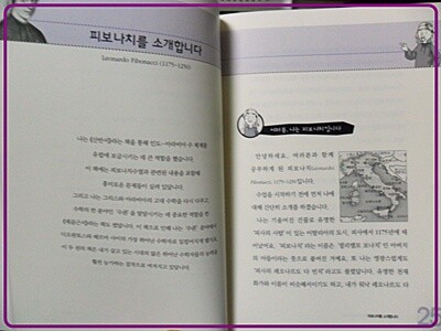 보나치는 인도-아라비아 수체계를 유럽에 처음 전파한 사람이라고 합니다. 제곱근서와 산반서를 통해 가장 뛰어난 수학자의 한 사람으로 인정되었고 "피사의 레오나르도 다빈치'로 불릴만큼 당대 최고의 천재가 아닌가 합니다. 책의 첫머리에 피보나치에 대해 자세히 서술해 줌에 따라 아이들은 수학의 기본 상식과 단순히 테크닉을 익히는 수학이 아닌 어떻게 보면 진정한 의미의 수학을 공부하는게 아닌가 하는 생각을 해보았습니다.
