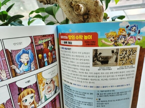 재미있는 창의 수학 놀이 수학도둑 91권에서는 바둑 게임이란 바둑은 인류가 만든 최고의 지적능력을 요구하는 보드게임이지요. 진행단계구분 : 흑백가리기 → 포석 → 중반 → 종반 → 끝내기 → 계가 → 승패 판정 ( → 복기) , 수학도둑 91권 부록 수학 응용력 쑥쑥! 수학도둑워크북도 응용편은 수학적 개념ㆍ원리와 응용 사례를 문제와 풀이가 실려 있어요