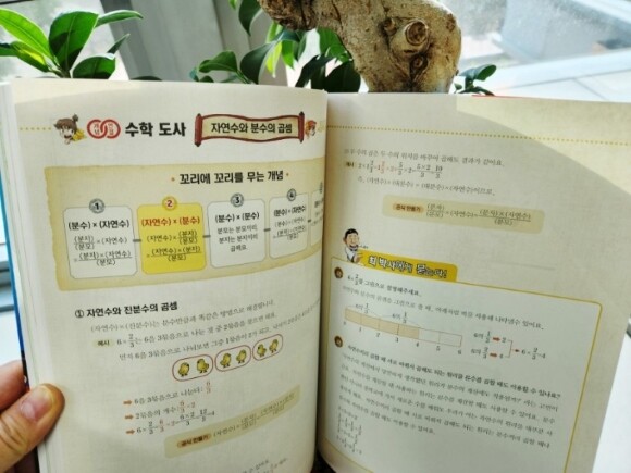 수학요괴전 8권 보이지 않는 위험 분수의 곱셈과 나눗셈’에서는 분수의 덧셈과 뺄셈을 다룬 7권에 이어 분수의 곱셈과 나눗셈을 배우네요 분수와 자연수의 곱셈은 분수를 자연수만큼 거듭해서 더하는거야.