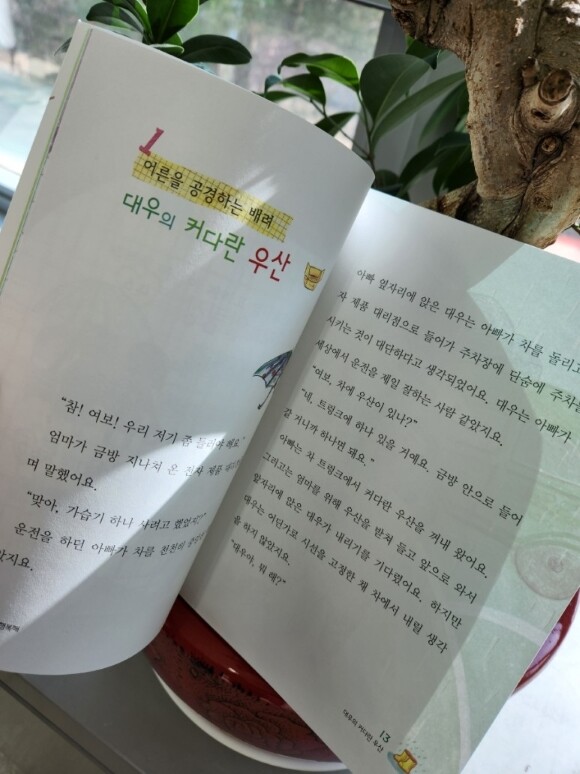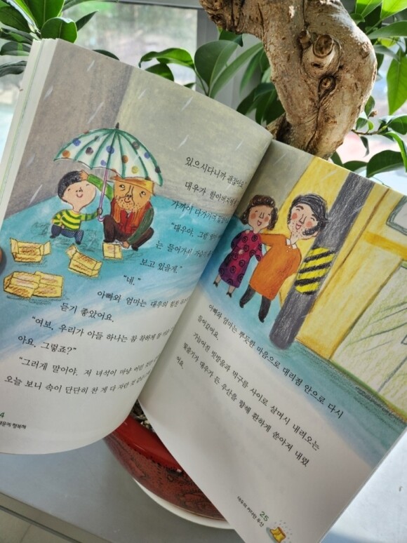 대우는 부모님과 가습기를 사러 가게 갔다가 폐지를 모아서 접고 있는 할아버지께 우산을 받쳐 주지요. 옆에서 가만히 우산을 들고 있는 대우를 보면서 참 기특하다는 생각이 들더라고요