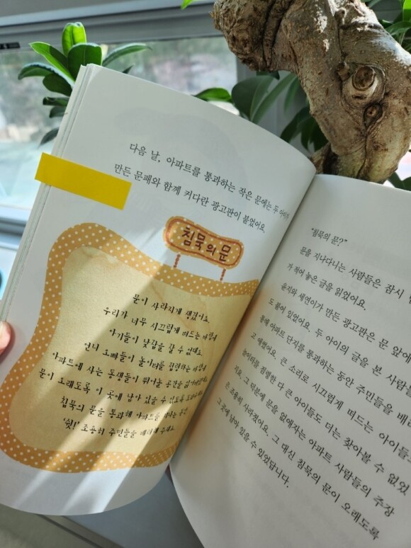 담벼락을 넘어다니는 아이들이 걱정이되어 담에 문을 달아주는데 너무 시끄러워서 아파트 주민들의 항의가 심해지고 문을 다시 없애자는 의견이 나오는데 윤지와 세윤이의 커다란 광고판 덕에 문이 사라지지 않지요 여러 사람이 함께 이용하는 문을 소중히 써야한다는걸 배울수 있어요