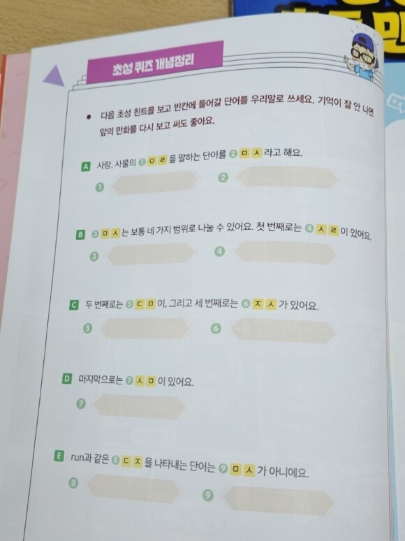 재미있는 스토리로 엮은 만화를 읽으며 이해하고, 한글의 초성을 이용하여 꾸민 퀴즈를 풀면서 문법의 내용을 정리하며, 마지막으로 문제를 풀면서 지금까지 배운 문법 내용을 얼마나 이해했는지 확인할 수 있더라고요