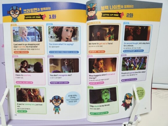 초등 생활영어 레벨업 애니메이션북 히어로 인사이드 1 는 챕터 1, 2,3,4로 되어 있는데 읽다보면 ★ 모양이 붙은 대사를 찾아 이동하라고 하는데 저는 그냥 만화를 먼저 쭈욱 읽고 나서 따로 레벌업 타임 초등생활영어 부록 편을 읽는게 도움이 더 되는것 같더라구요 아이 취향에 맞게 활용 해주면 될것 같아요~