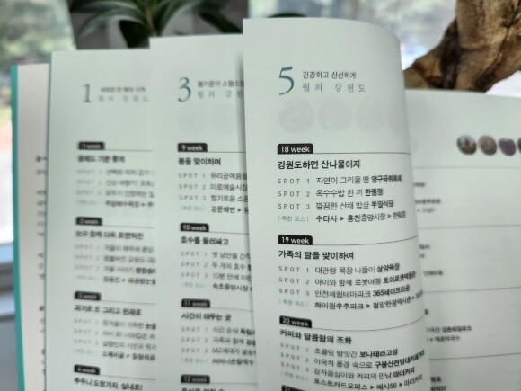 최신 개정판 52주 여행, 우리가 몰랐던 강원도 408 월별 코스를 소개하는 것으로 한 달간의 여행이 끝난다. 그달에 떠나면 좋을 지역별 최적의 여행지를 2박 3일 또는 1박 2일 코스로 도식화하여 한눈에 보여주고, 오른쪽에는 해당 코스에 포함된 여행지의 모습을 사진으로 소개한다.