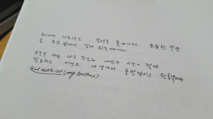 이 말씀을 날마다 되새기며 처음 이 문장을 대했을 때에 다짐이 식더지지 않도록 방문 입구에 붙여 놓았습니다. 그리고 다짐합니다. 복음전파에 더욱 힘쓰며 살겠습니다. 주님이 기다림의 화석이 되지 않으시도록 말입니다.