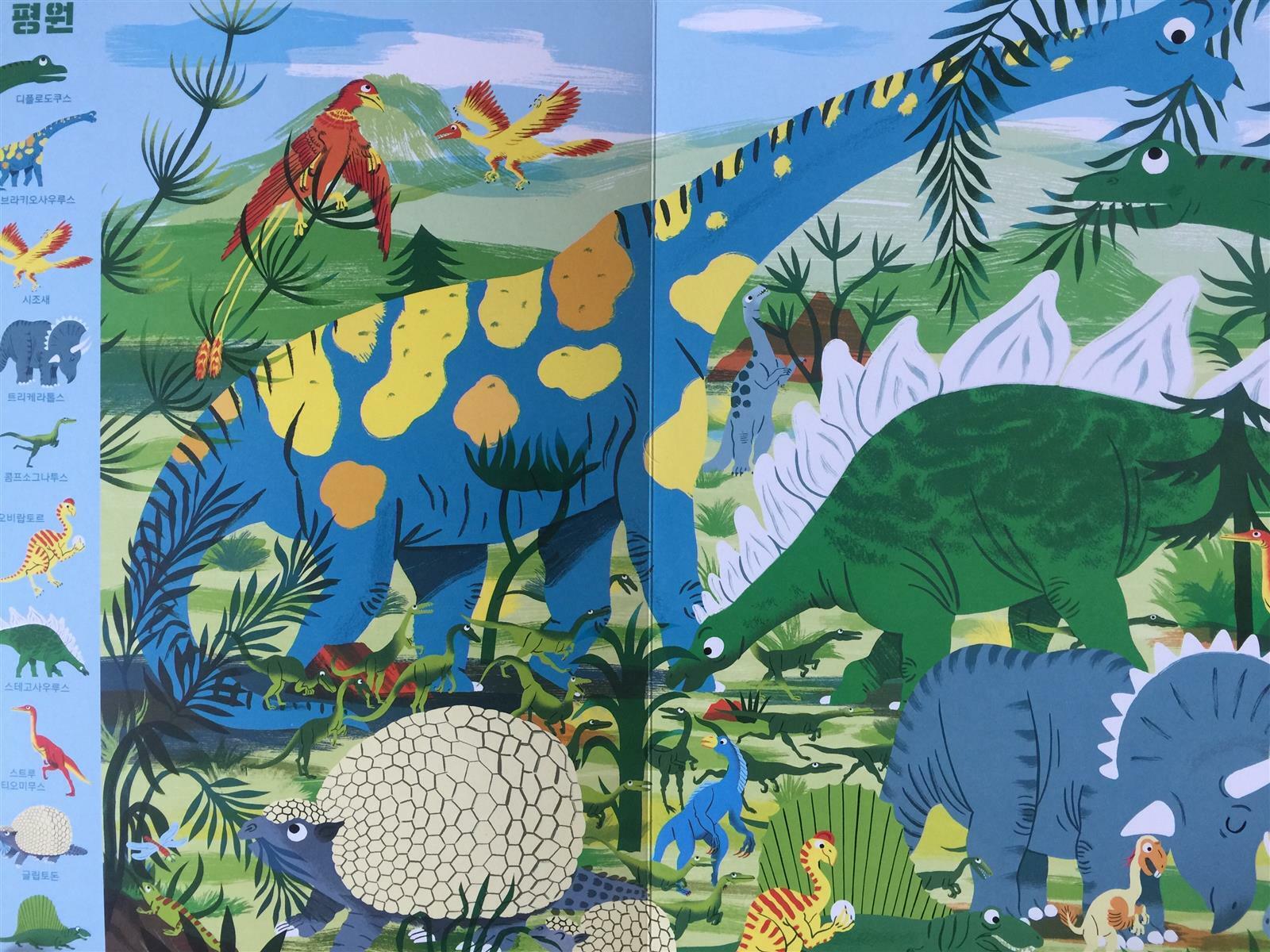 공룡이 한 가득 그려진 그림 왼쪽에는