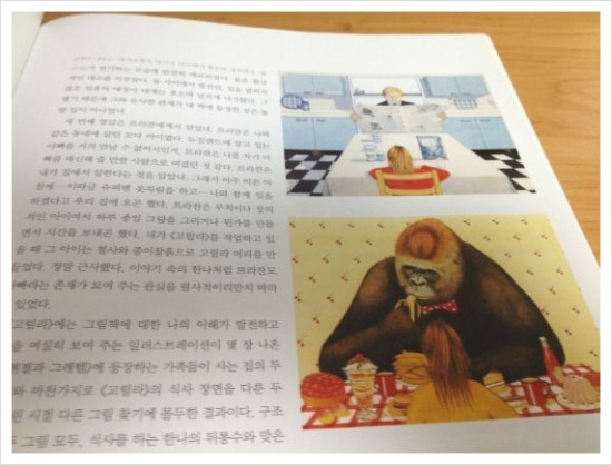 고릴라와의 식사 장면에서는 원근을 낮추어 두사람이 가까워 보이게 했으며 밝은 색조를 강조하여 따뜻한 느낌을 부여했다고 되어 있다.  책을 읽을 때 깨닫지 못한 느낌들을 다시 알 수 있도록 해 준다.