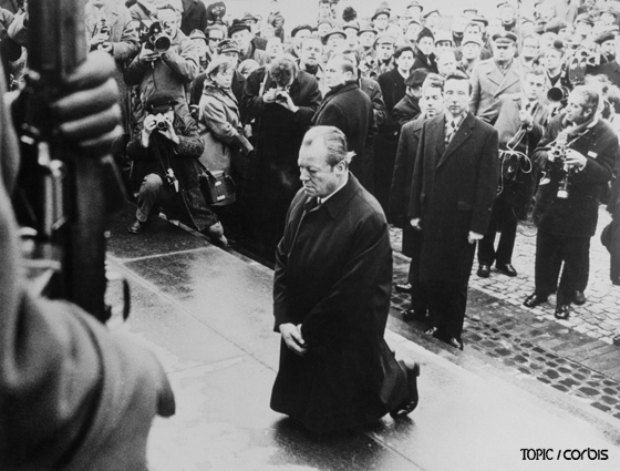 1970년 12월 7일 폴란드 수도 바르샤바의 2차 세계대전 시기에 희생된 유태인을 기리는 위령탑 앞. 서독의 총리 빌리 브란트가 헌화를 하던 도중 털썩 무릎을 꿇었다.