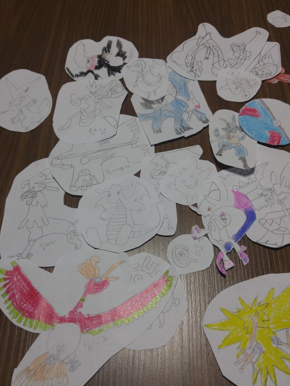 쓱쓱~~~뭔가 그리더니 만화 캐릭터들을 그렸네요...