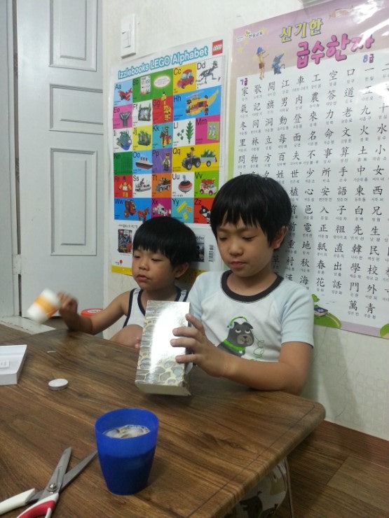 아이들 둘이 신 나서 실험키트를 만들고 있다...