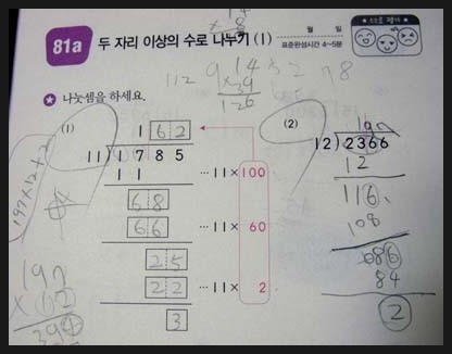 나눗셈 답이 맞았는지 역으로 곱셈해보느라 지면이 좀 어수선하네요.
