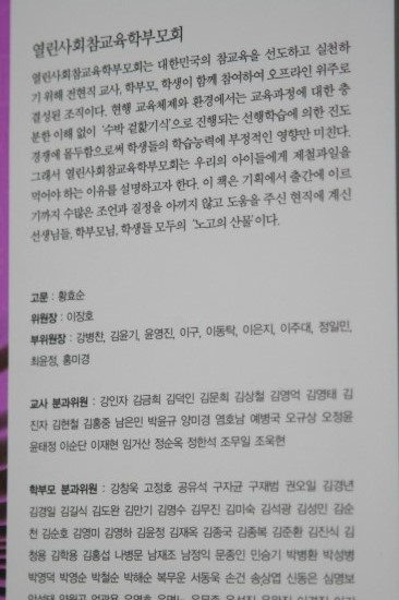 개인적으로 책을 보기전에 저자가 누구인지, 어떤 성향의 사람인지를 먼저 보게 되는데 이 책은 저자가 누구인지 애매하다. 읽고 난 후의 추측으로는 이 책의 주된 저자(편집자일 수도 있으리라 생각되지만)는 교육관련 공무원 생활을 하신 분이 아닐까 싶었다. 책의 내용이 대부분 교육정책에 대한 현상이나 폐해에 대한 지적과 설명이고 그에 대한 해결방안은 별로 없는 것처럼 보인다. 그나마 제시한 해결방안내용은 원론적인 수준인 것 같아 보인다. 그러나 공교육정상화에 대해서는 교사입장 위주로 서술된 듯한 느낌이 많이 드는데 이것 때문에 저자가 교육관련 공무원 생활을 하신 분 아닌가 싶었다. 책 앞부분에 지은이로서 "열린사회참교육학부모회"라는 애매한 단체를 내세우고 있는데, 이 단체의 고문,위원장,부위원장,교사/학부모/학생 분과위원 등 161명 명단을 한꺼번 올리는 것도 역시 웬지 뭔가 좀 깔끔하지 못하단 느낌을 받았다.